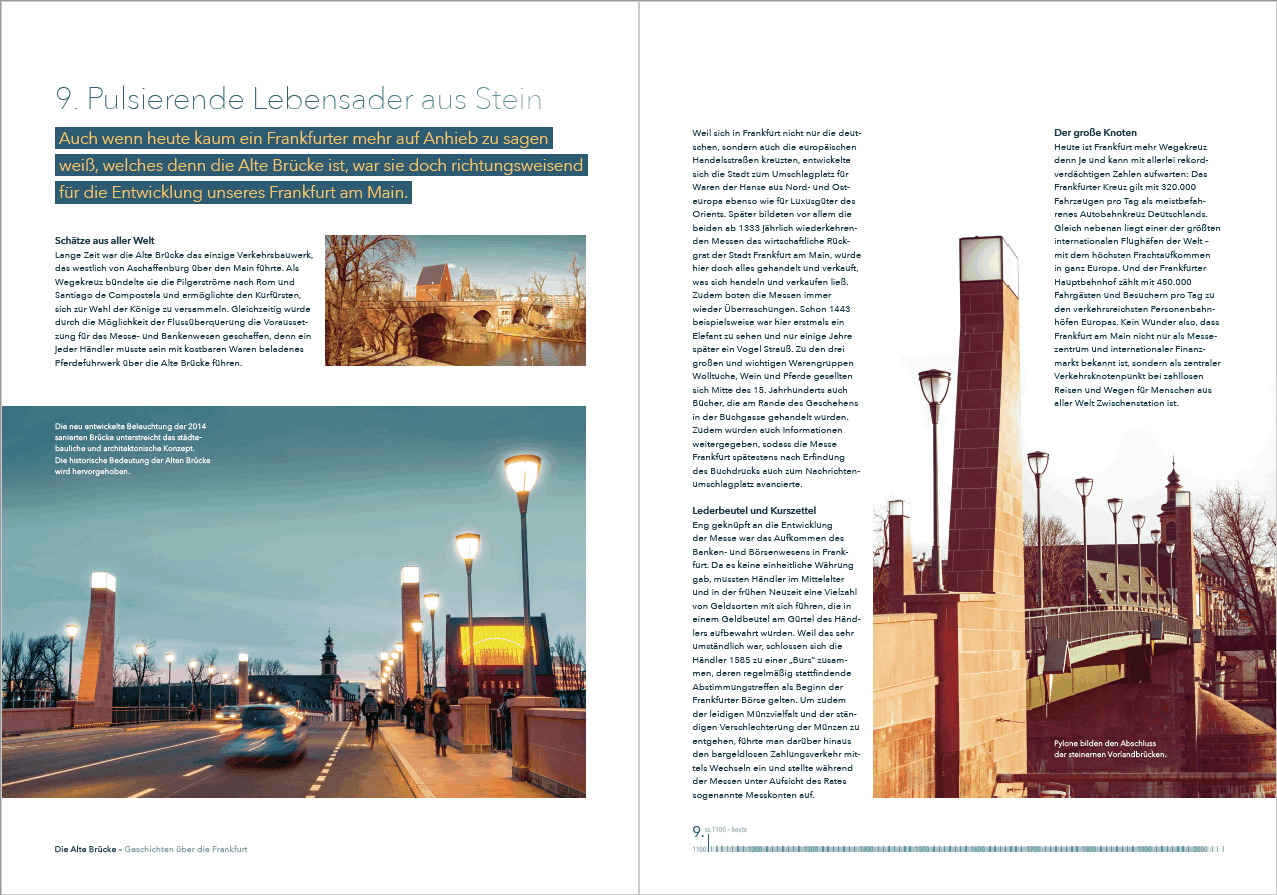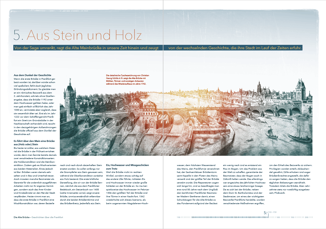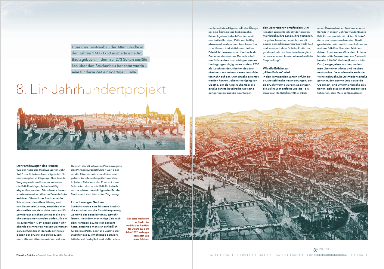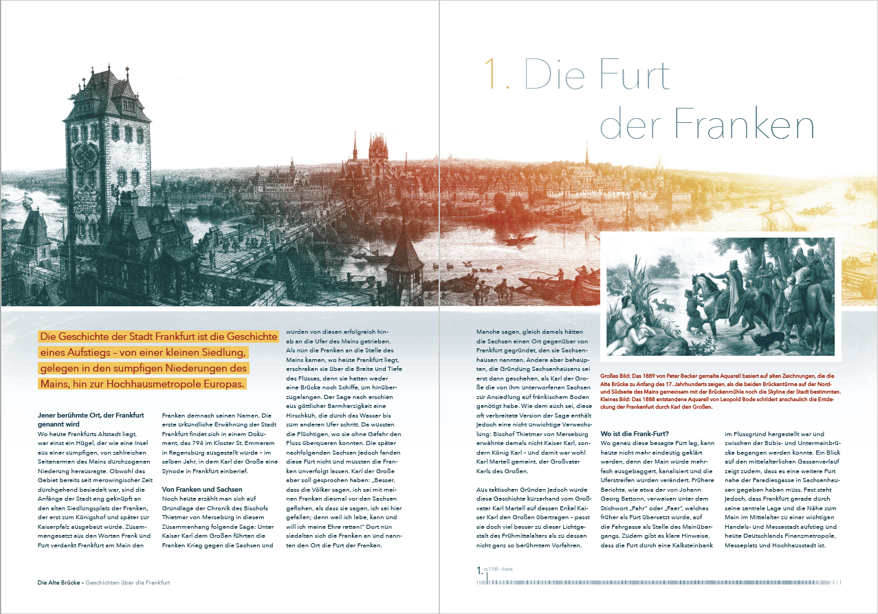 Konzeption, Recherche und Text für die Broschüren "Die Alte Brücke" und "Der Lange Franz" des Brückenbauvereins Frankfurt, ergänzend Webseite, Anzeigen und Zeitungsbeilage