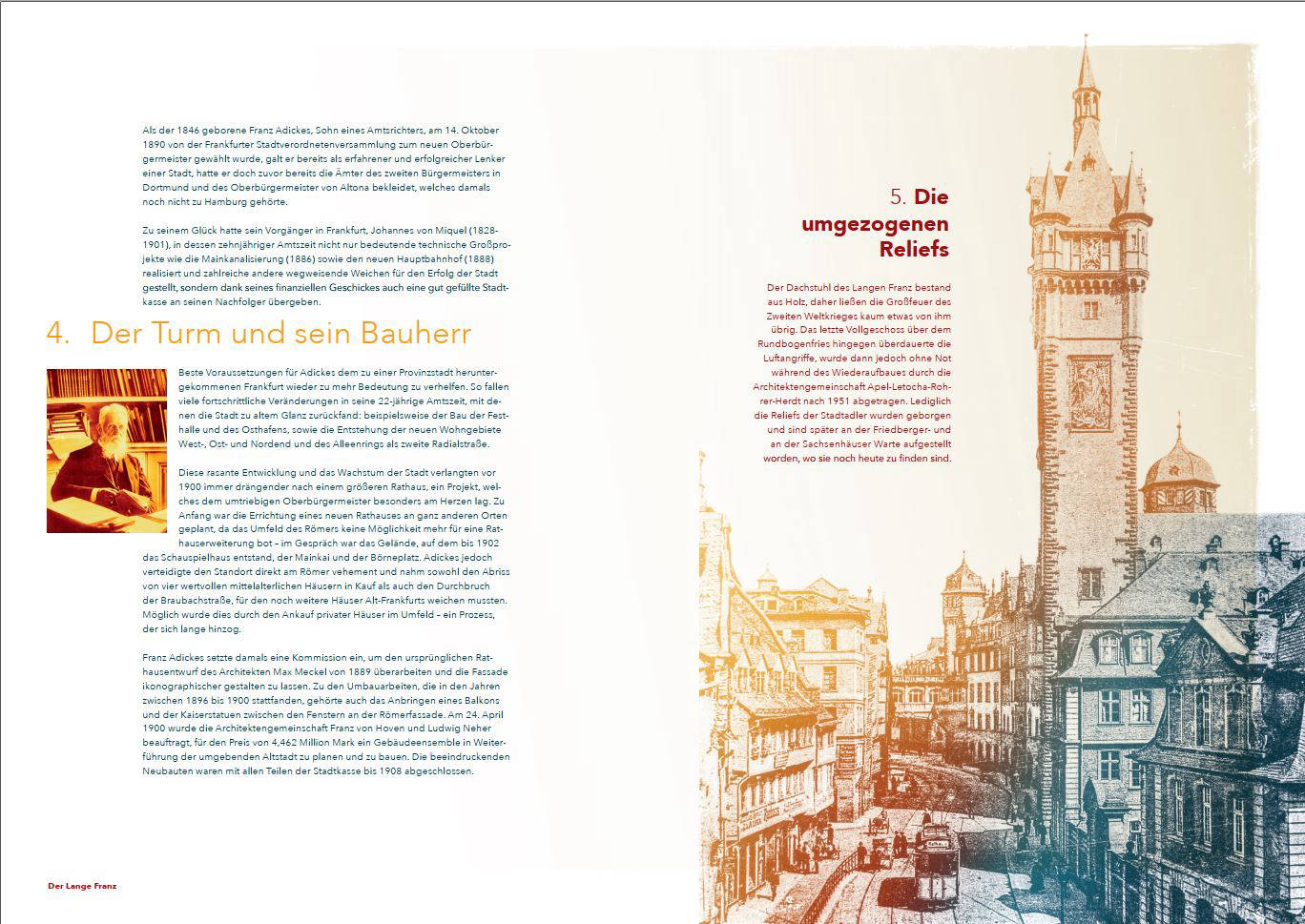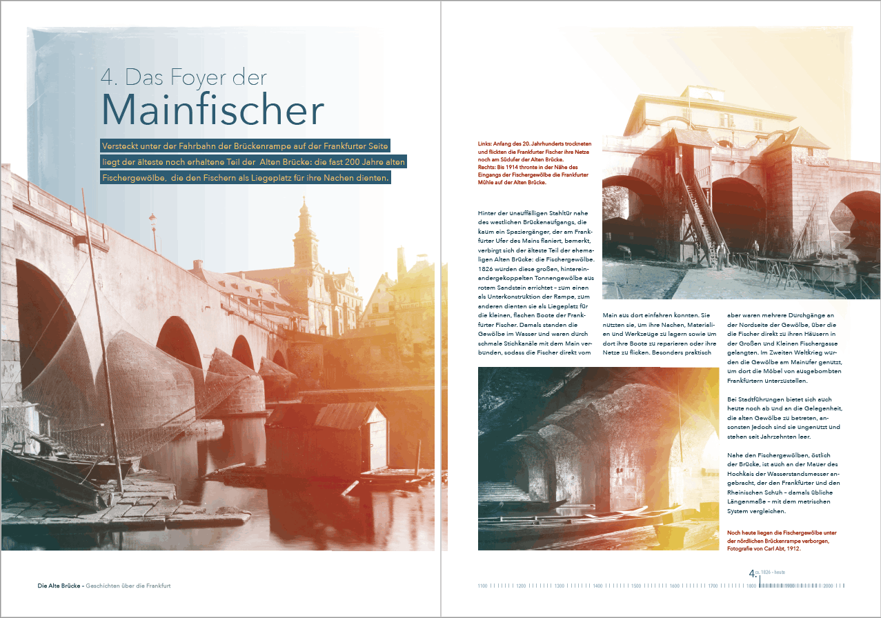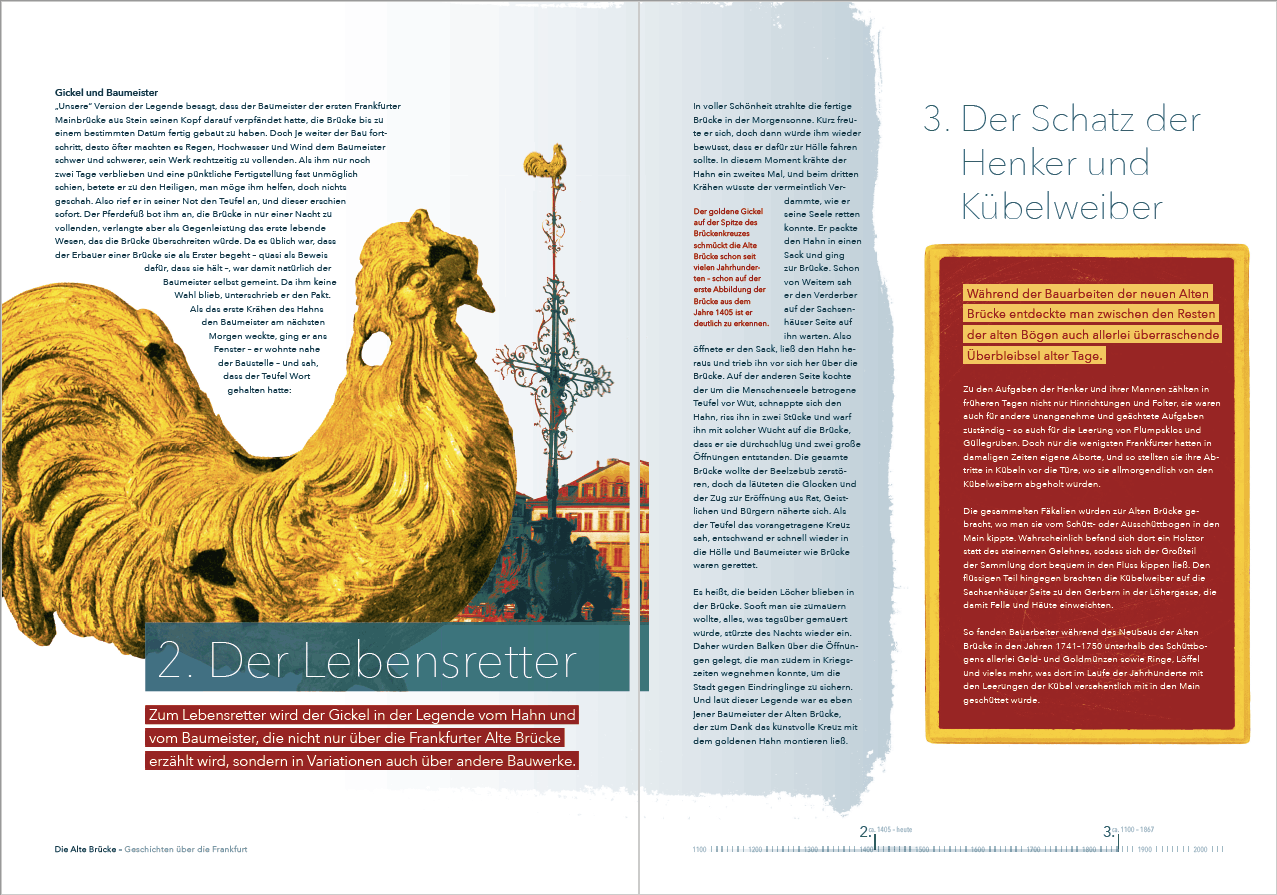 Konzeption, Recherche und Text für die Broschüren "Die Alte Brücke" und "Der Lange Franz" des Brückenbauvereins Frankfurt, ergänzend Webseite, Anzeigen und Zeitungsbeilage