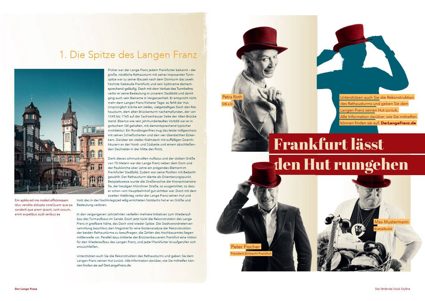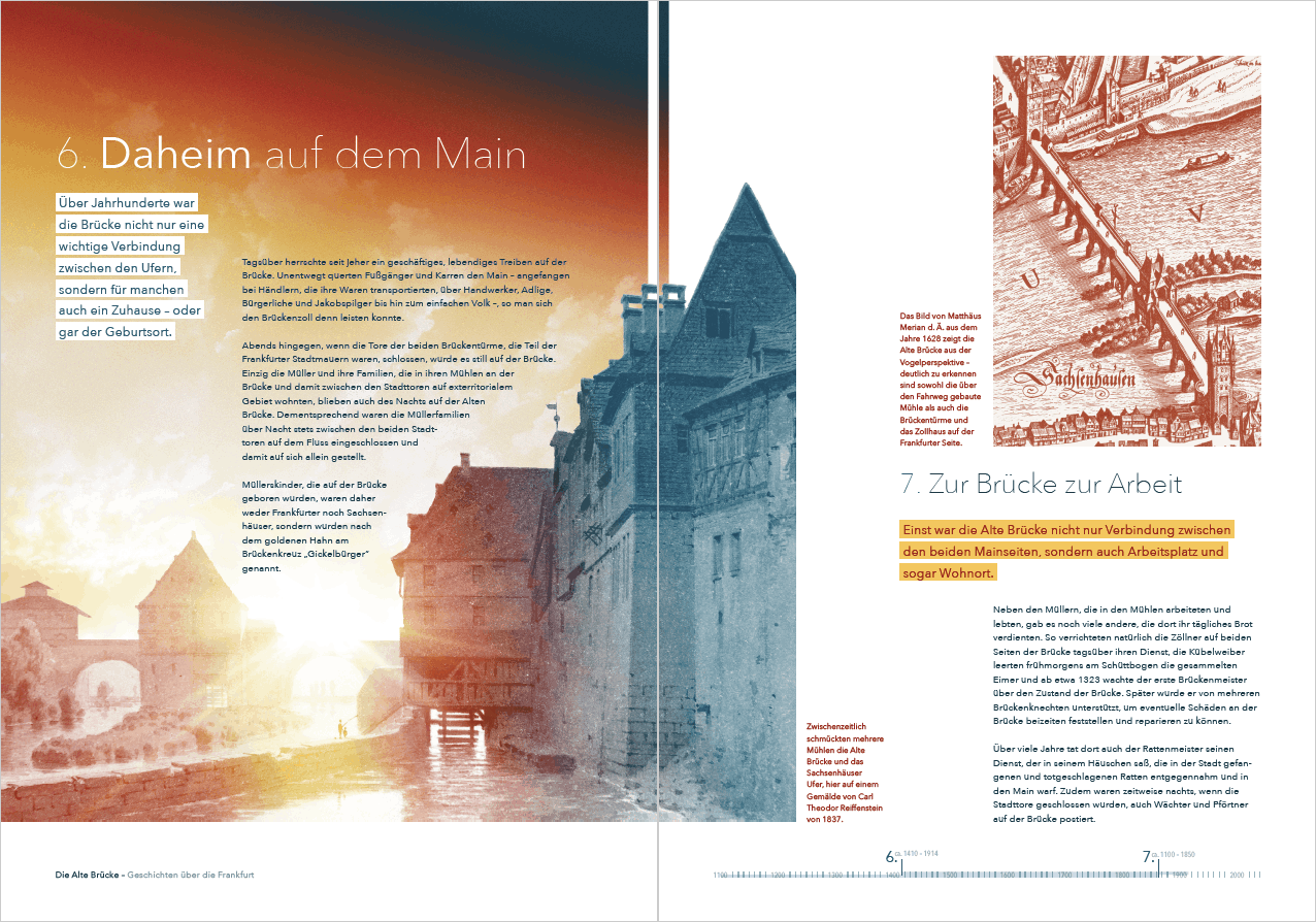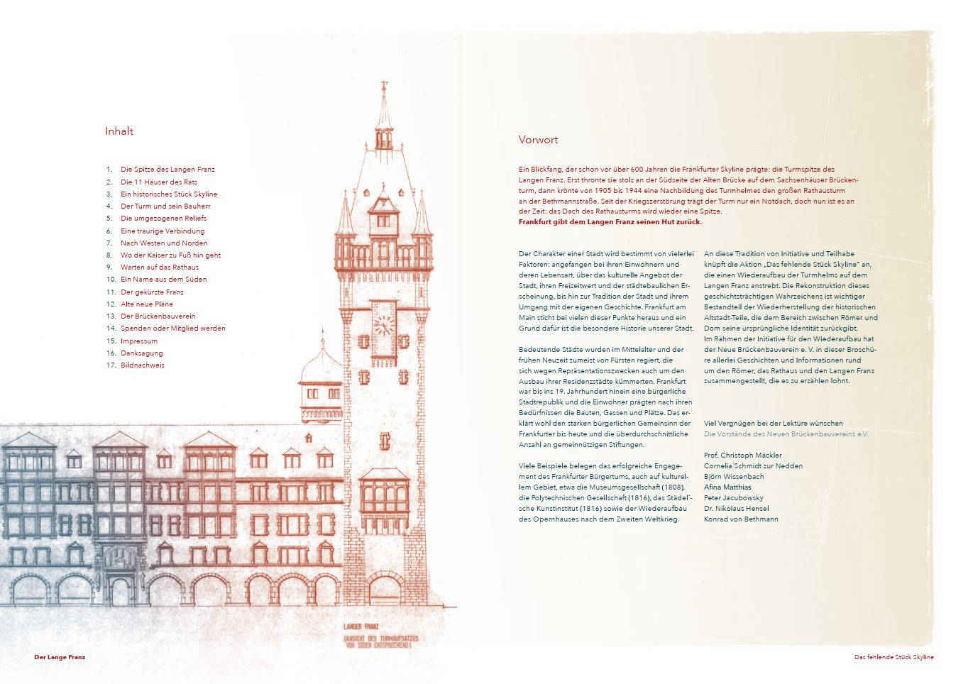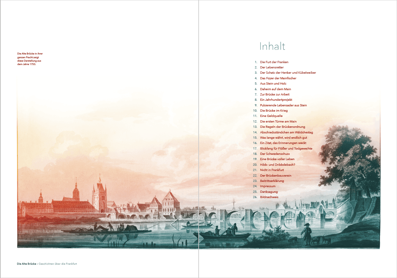 Konzeption, Recherche und Text für die Broschüren "Die Alte Brücke" und "Der Lange Franz" des Brückenbauvereins Frankfurt, ergänzend Webseite, Anzeigen und Zeitungsbeilage