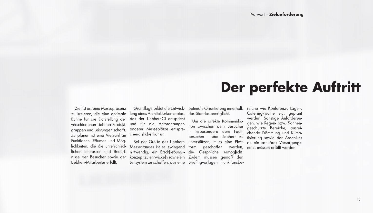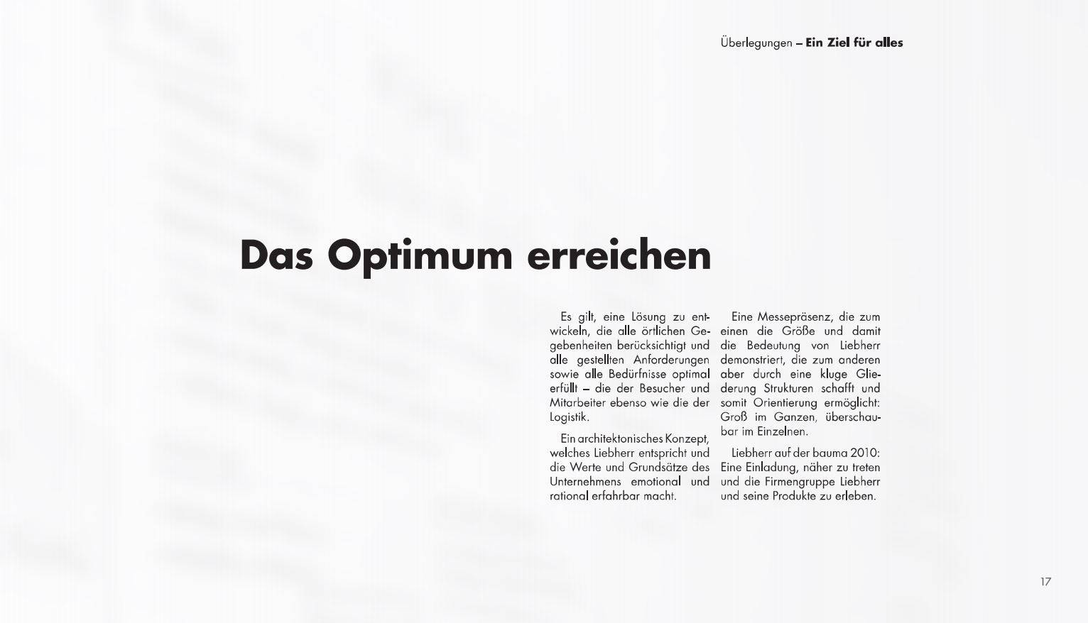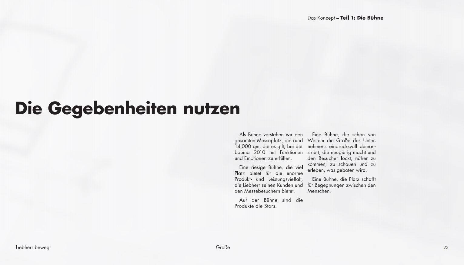 Text und Konzeption eines 96-seitigen Präsentationsbuchs zur Messe-Architektur von Liebherr (Wettbewerbspräsentation)